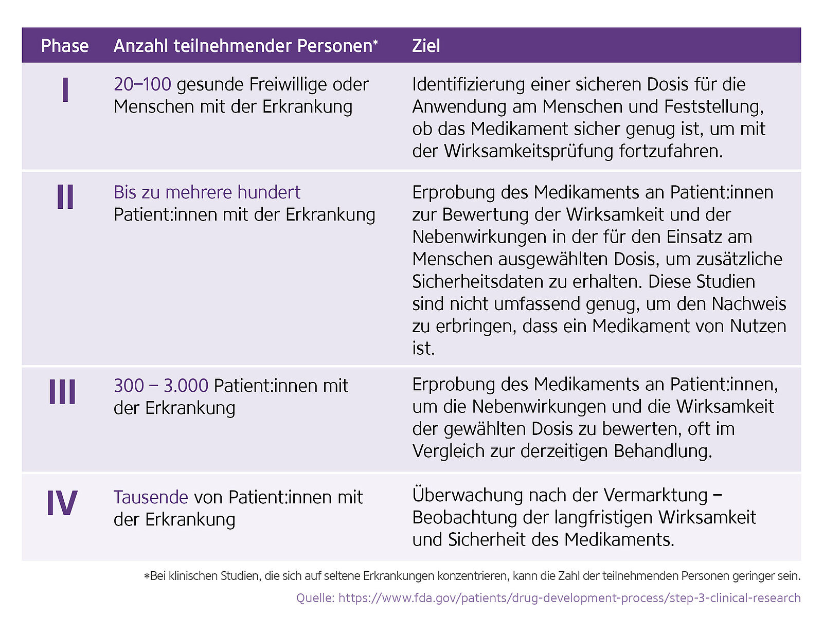 Der Prozess der Arzneimittelentwicklung durchläuft in der Regel vier Phasen, in denen die Wirksamkeit und Sicherheit der Substanz über viele Jahre hinweg an einer wachsenden Zahl von Patient:innen untersucht und beurteilt werden. Wenn das Medikament die klinischen Phasen (I, II und III) erfolgreich durchläuft, wird es in der Regel von der zuständigen Aufsichtsbehörde für die Verwendung in der klinischen Routinepraxis zugelassen.