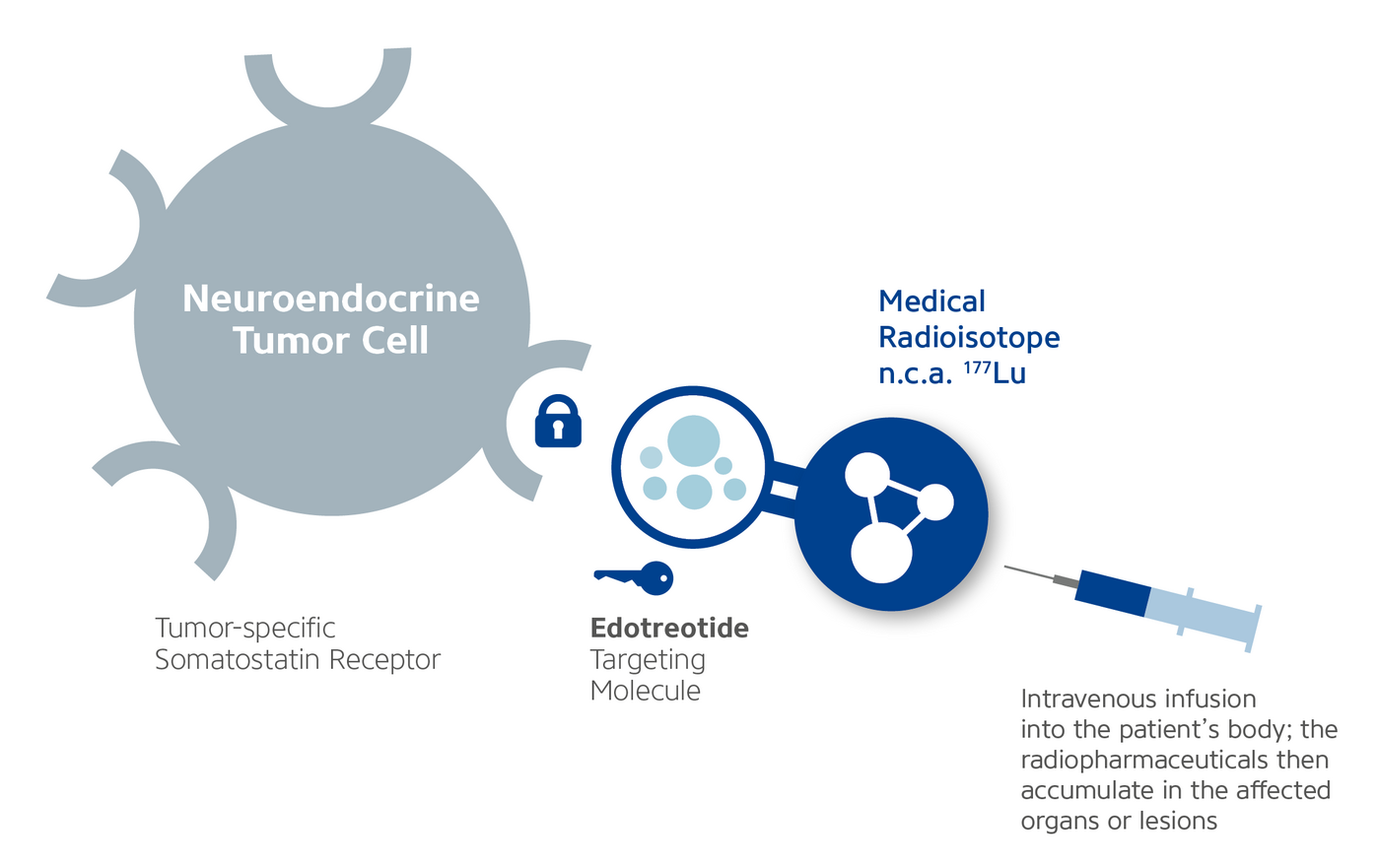 Healthy neuroendocrine cells have somatostatin receptors on their surface. The neurotransmitter somatostatin regulates the endocrine system within normal body functions by binding to these receptors according to the lock-and-key principle. Targeted radiopharmaceutical therapy uses this same principle to treat NETs. The therapy is based on the fact that neuroendocrine tumor cells often express an increased number of somatostatin receptors on their surface, displaying a unique tumor characteristic that differs from that of healthy neuroendocrine cells.* Just like the naturally produced hormone somatostatin, Eedotreotide binds to these receptors and places the medical radioisotope n.c.a. Lutetium-177 directly onto the diseased neuroendocrine cells so that it accumulates at the tumor site. N.c.a. Lutetium-177 is internalized into the tumor cells and decays, releasing medical radiation (ionizing β-radiation) with a maximum radius of 1.7 mm and destroying the tumor. Thanks to the highly precise localization, the healthy tissue surrounding the targeted tumor is minimally affected.